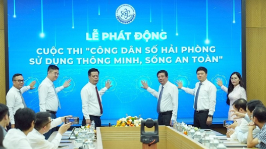 Các đại biểu thực hiện nghi thức phát động Cuộc thi “Công dân số Hải Phòng – sử dụng thông minh, sống an toàn”